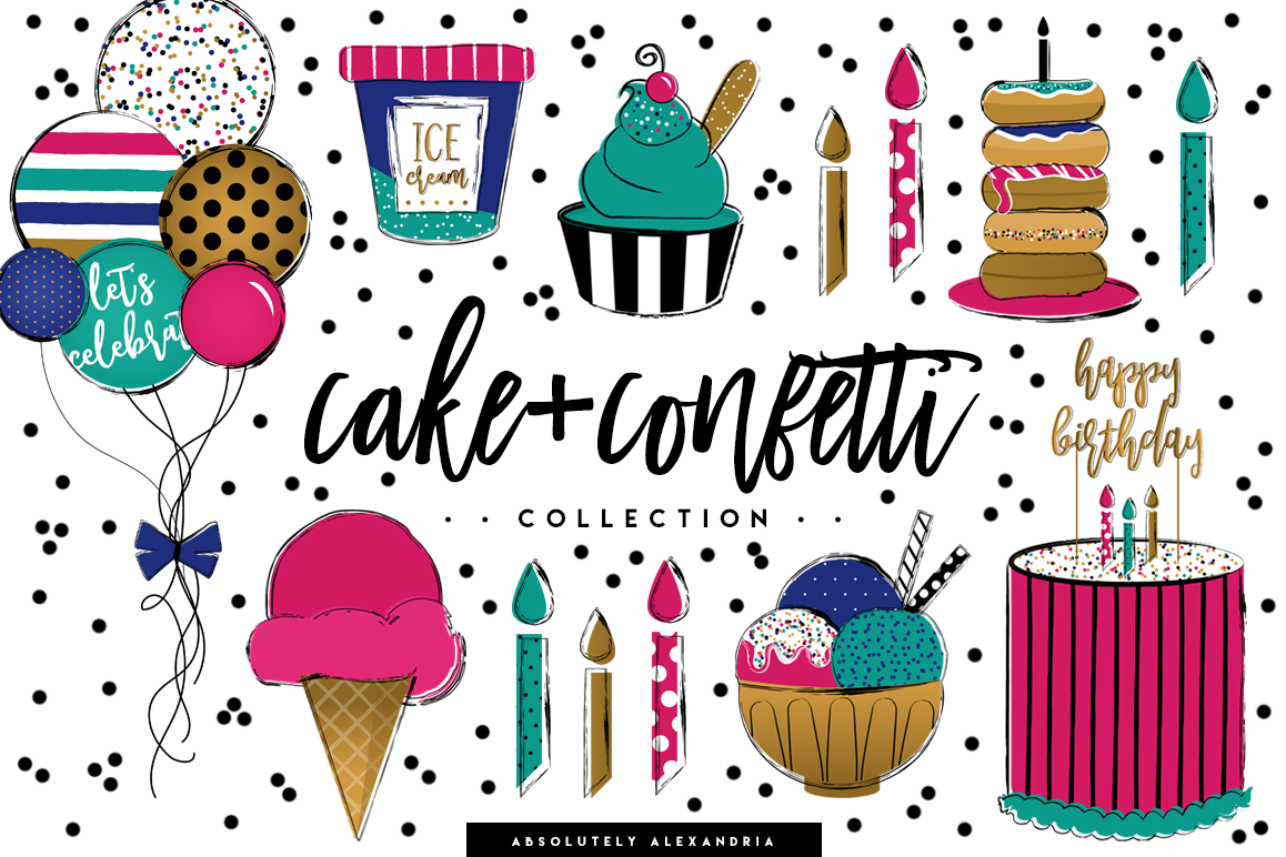 Cake + Confetti Clipart Illustrations & Seamless Digital Paper Patterns Bundle