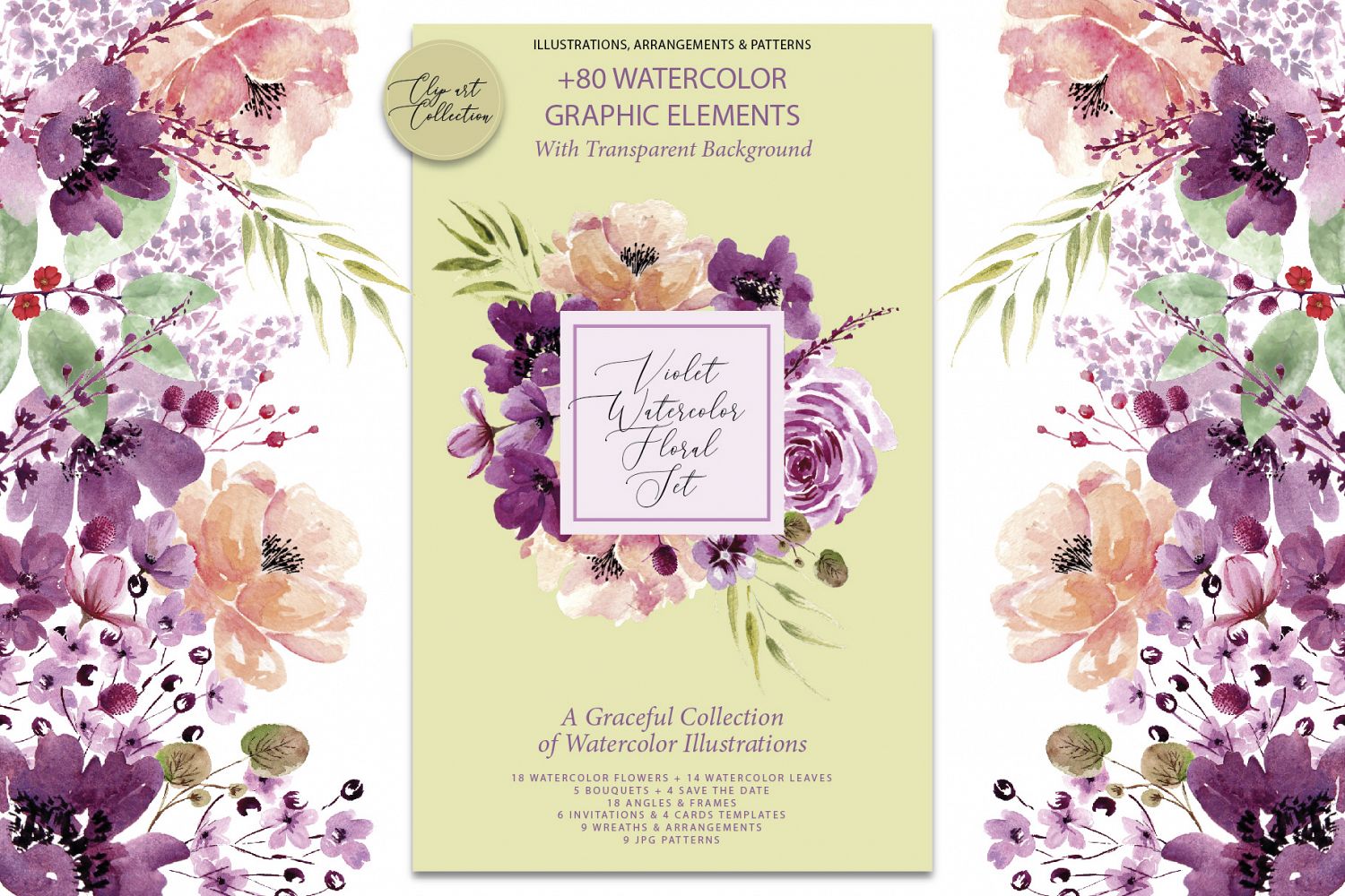 Violet Watercolor Floral Set I am pleased to present to you my new watercolor collection of Violet watercolor flowers. The perfect design for greeting cards, digital projects, scrapbooking, decoration for cards, wedding invitation, textiles, packaging, kitchen decor, home art prints, cosmetics, natural and food products. You can create unique bouquets, frames, wreaths, patterns for your project.• This collection includes 87 files: