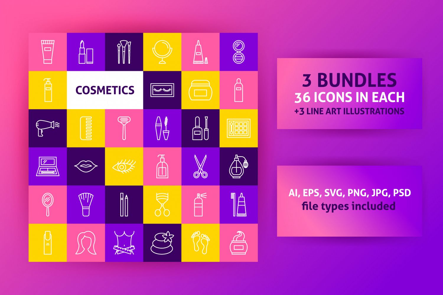 • 2 Cosmetics Line Art Icons over different backgrounds (36 icons in each set);