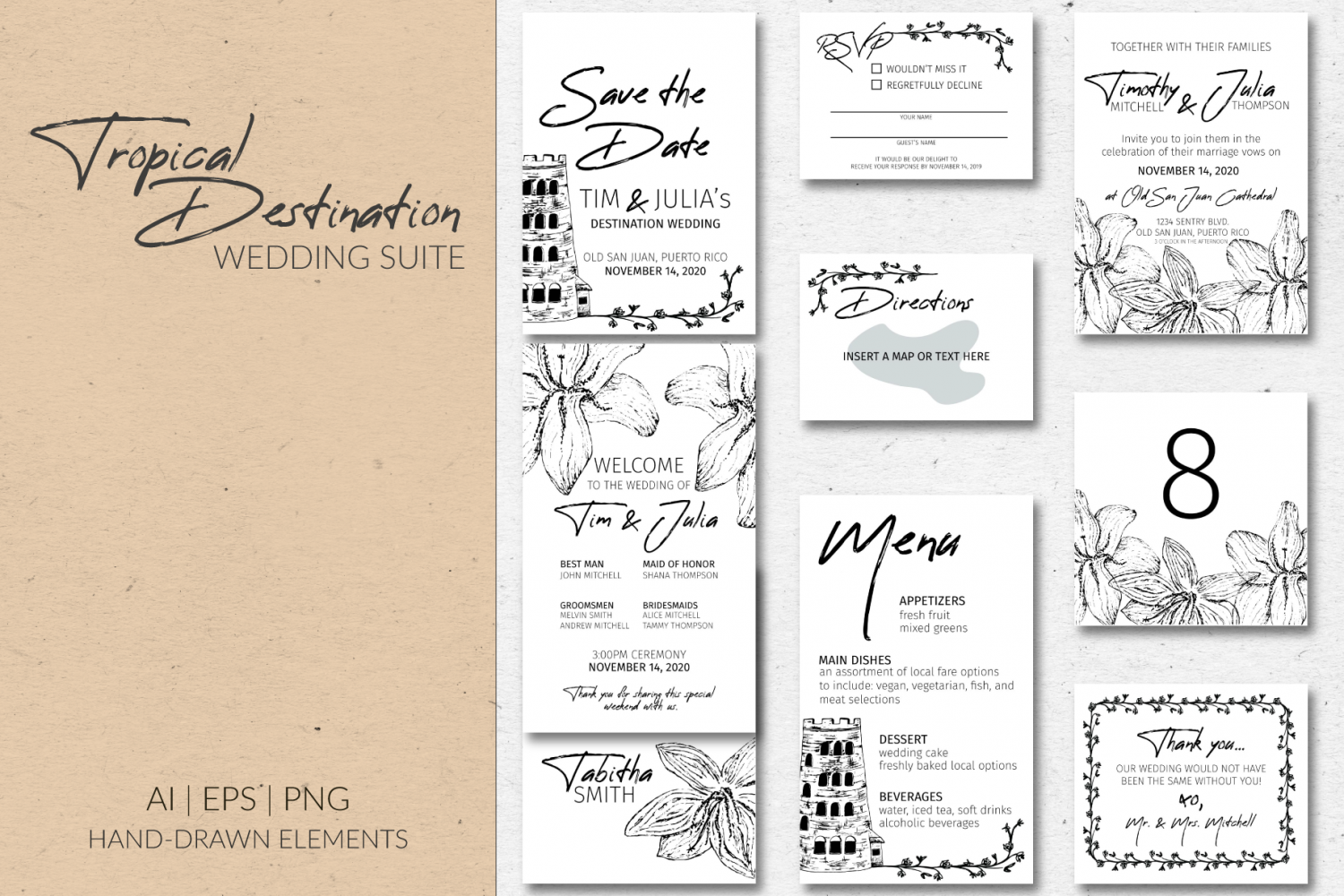 Inspired by Puerto Rico’s El Yunque Rain Forest, this Tropical Destination Wedding Suite is ready for you to add your special touch.Created with hand-drawn elements of the rain forest tower and rain lilies, text and graphics can remain black, or you can personalize them with color fills, textures, or overlays.