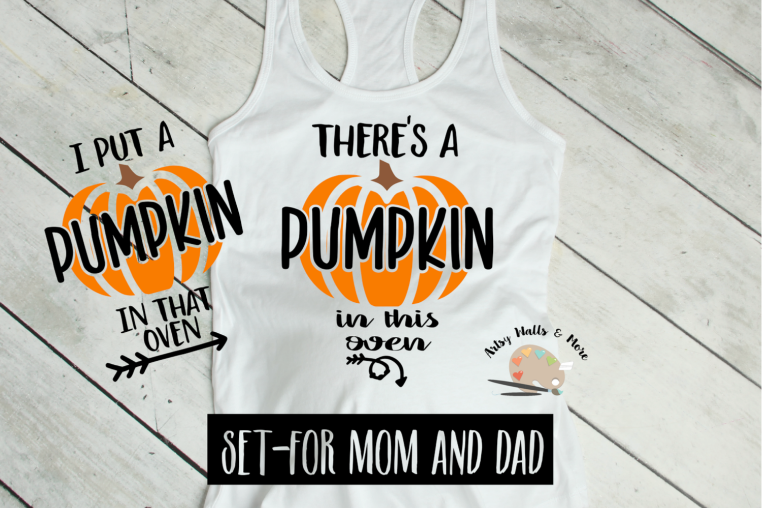 "There's a pumpkin in this oven" AND "I put a pumpkin in that oven" Soooo cute for an expecting/ pregnant mother and father for  DIY t-shirst as a Maternity Halloween costume or just  Fall maternity shirts. Great for a Fall baby reveal for the mommy and daddy.