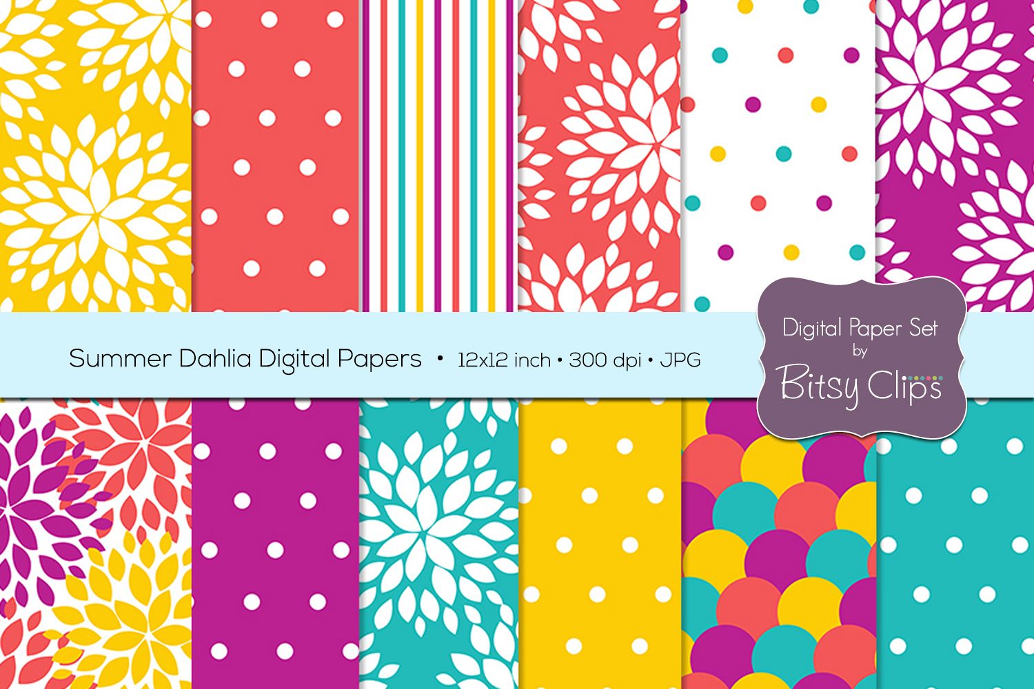 This 12 piece digital paper set is full of beautiful bright dahlia flowers. The set also includes lots of polka dots, stripes, and more!
