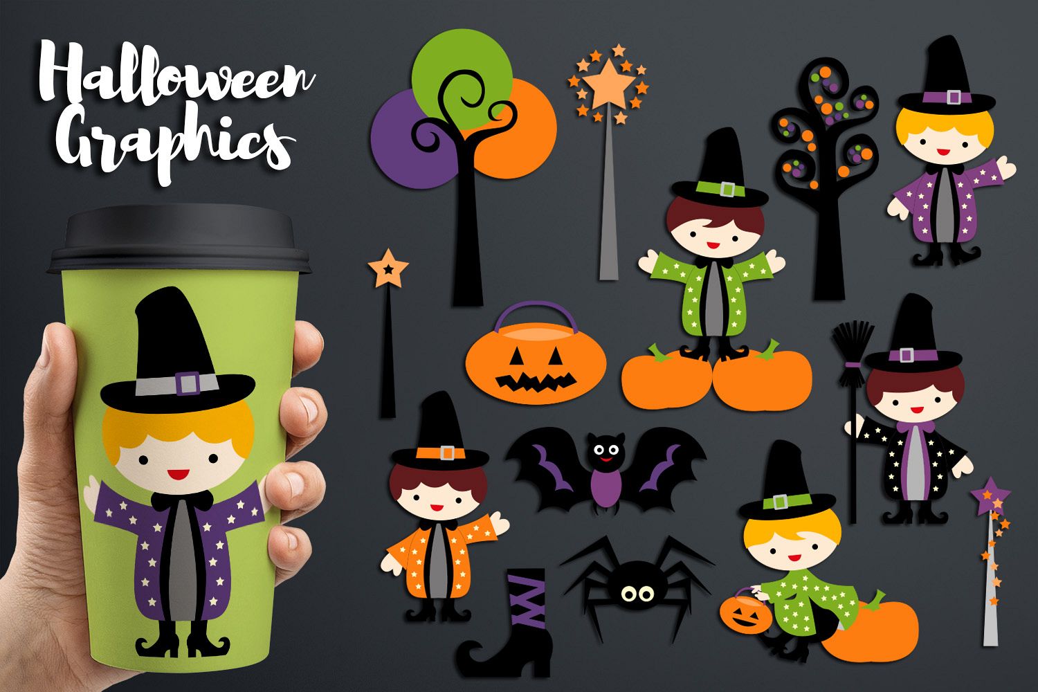 Cute Halloween wizard boy cliparts. Magic wand, pumpkin, bat, spider, and more fun graphics.