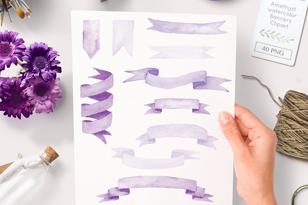 Similar Design Products to watercolor ribbons and banner clipart purple lilac graphics