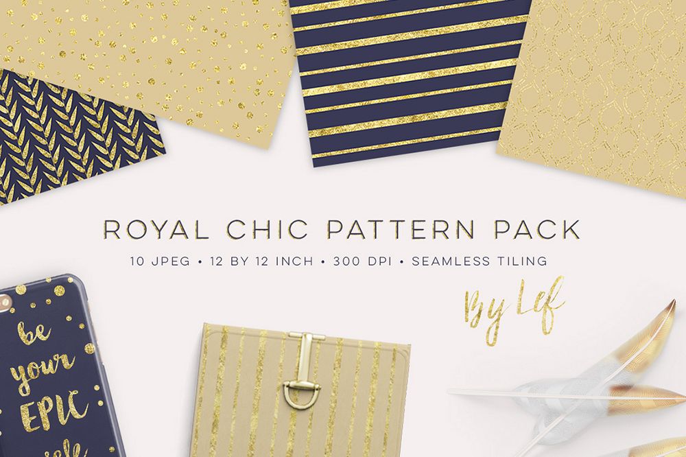 This pack includes seamlessly tiling quatrefoil, dots, arrows, stripes and a leafy pattern. What a royal combination this is. Gold and Navy Blue. Instant chic right there. You can use these for scrapbooking, making printables like wall-art cards and invites or whatever else comes to mind. I have added some imaginary products in the preview image. They are seamlessly tiling so they work great for blog and web backgrounds if that's what you're after.