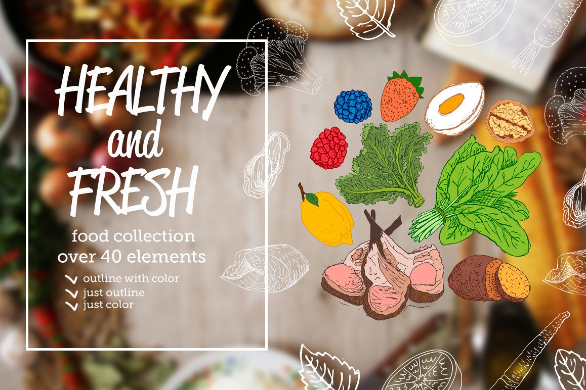 HEALTHY and FRESH - bright, delicious and luscious food collection including over 40 different elements. All of them were hand drawn, carefully scanned and coloured in Illustrator. Three variation of the same picture will give you almost endless possibilities. Do you need vegetable's outlines for a food blog? You're welcome! Or colorful berries for menu? Here you go! Different food realization for a lot of design projects! Turn on your imagination and add HEALTHY and FRESH to your wonderful project!