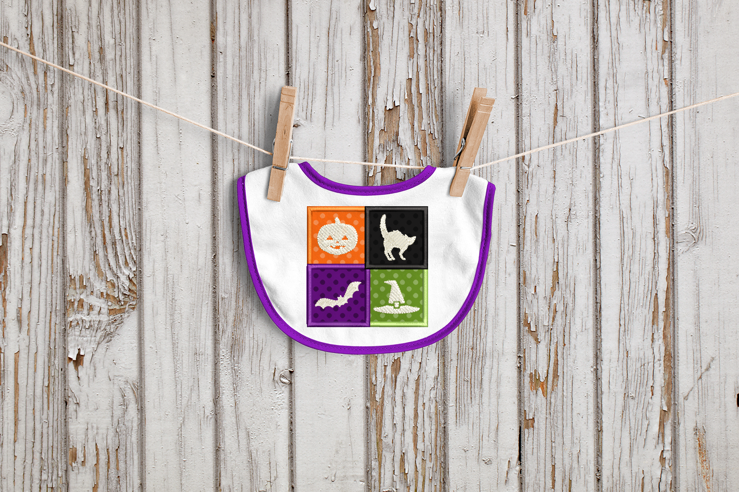 This adorable Halloween themed design features 4 applique squares, each with a different spooky icon. Includes a jack-o-lantern, a scared cat, a vampire bat, and a witch hat.
