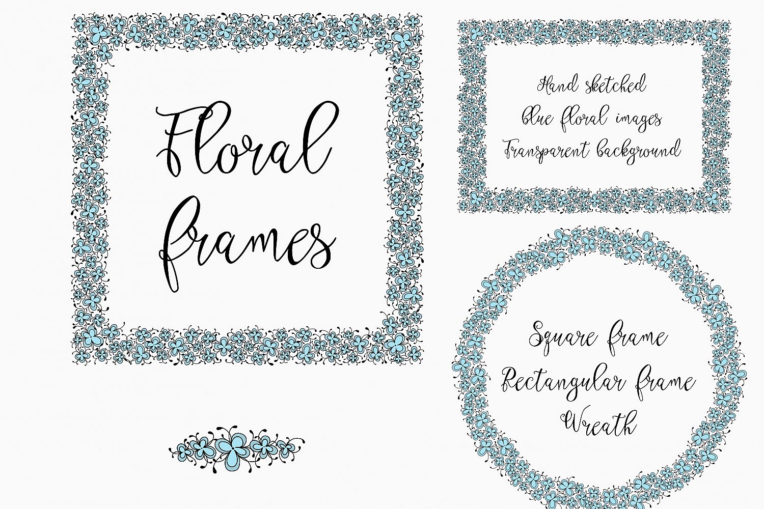 Hand drawn blue floral frames, perfect for greeting card and invitations designs.