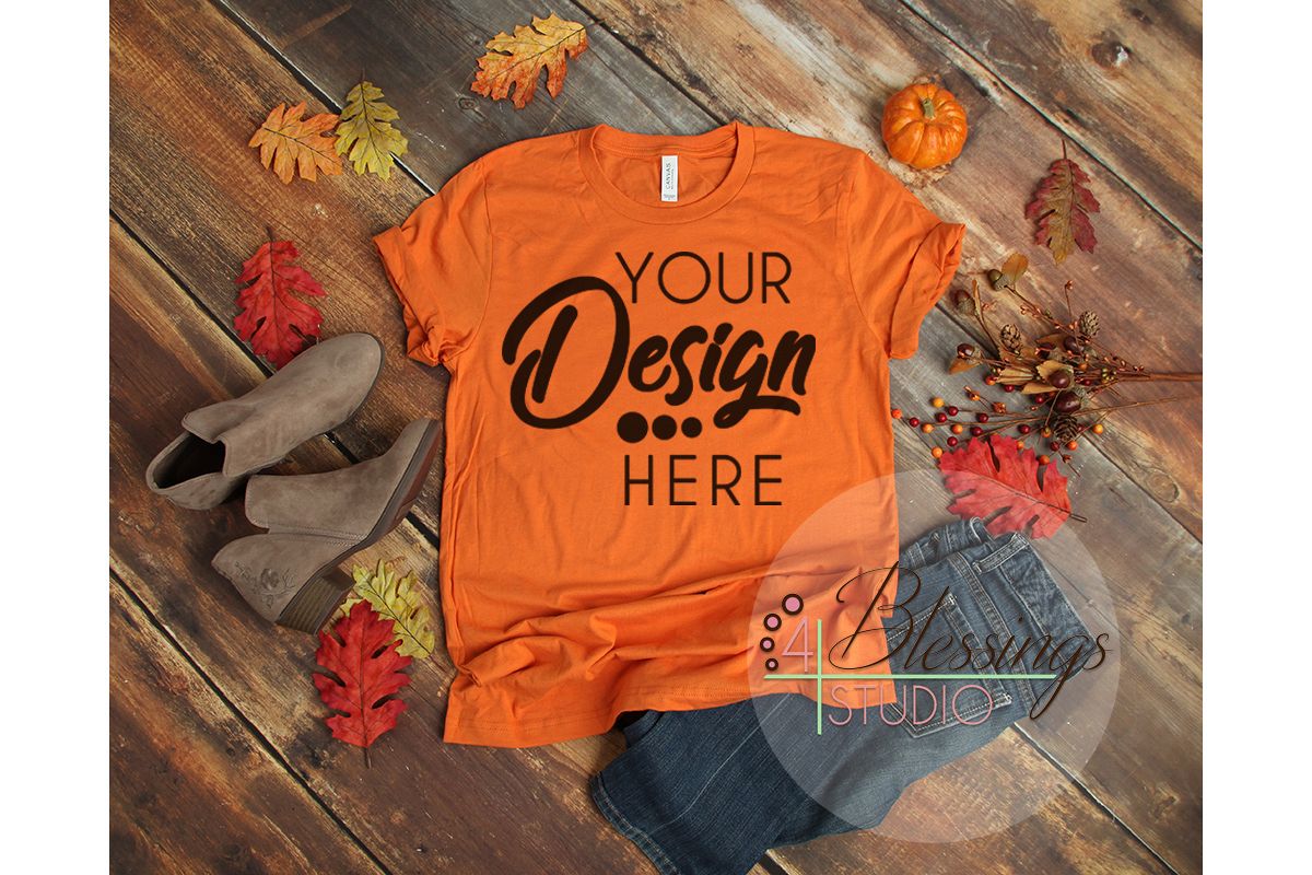 Bella Canvas 3001 Burnt Orange Unisex T Shirt Mockup on a rustic brown wood background with fall accessories