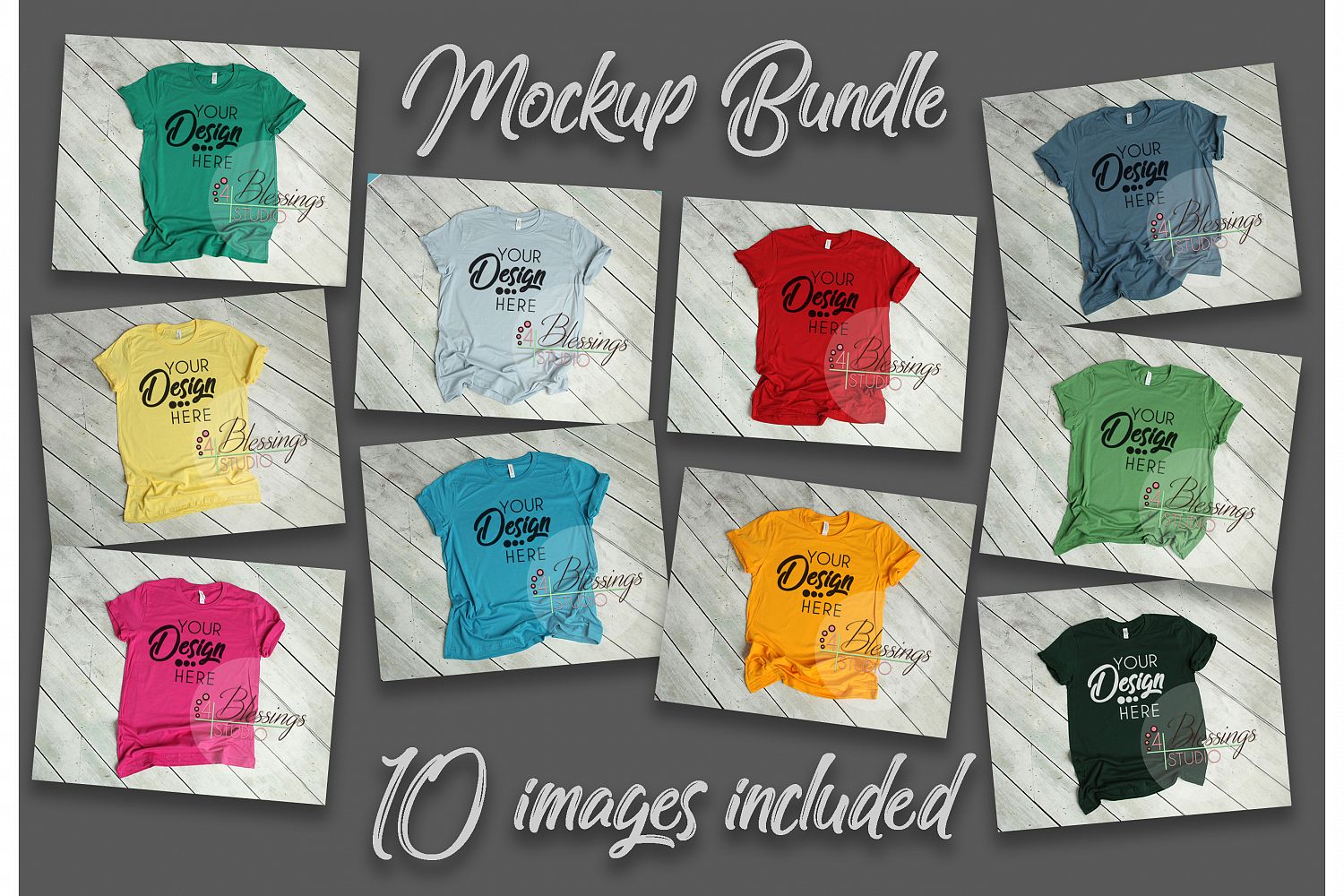 This bundle includes 10 mockup images of Bella Canvas 3001 Unisex T Shirts with rolled sleeves on a white wood background.