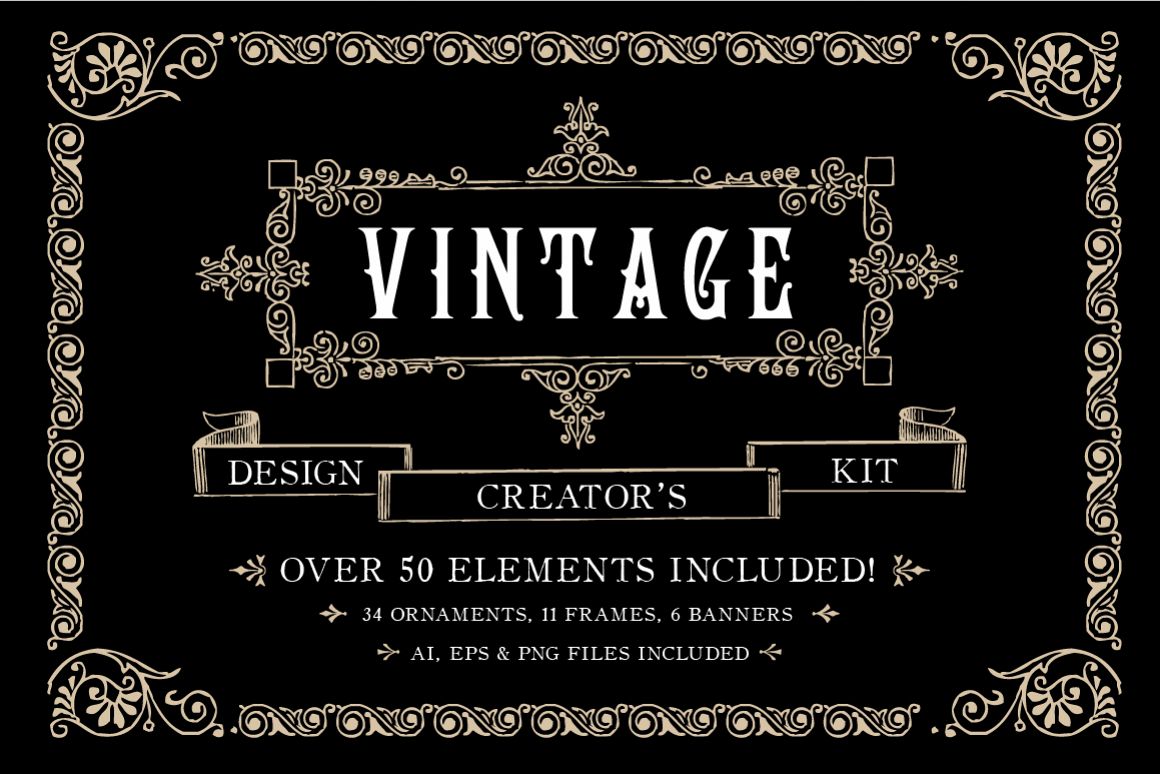 Introducing the Vintage Design Creator’s Kit with over 50 vintage elements ready to use in your designs! These ornaments, frames & banners are textured to give your design an authentic vintage feel. Six bonus repeating border brushes included in the vector files!