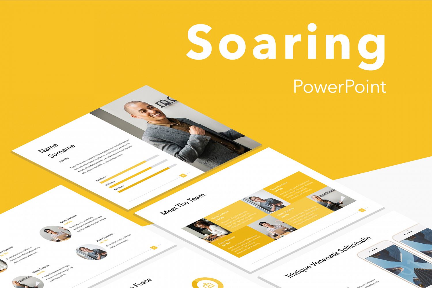 The Soaring template offers a professional look for your unique MS PowerPoint slideshows. It includes 20 masters in the standard 4:3 size, allowing you to choose the best layout for your information. The modern, polished layouts go beyond mere backgrounds, fonts, and bullets: they contain matching charts, diagrams, tables, and other data visualization elements. The template can be opened and edited in MS PowerPoint for Mac 2011 or later as well as MS PowerPoint for Windows 2007 or later.