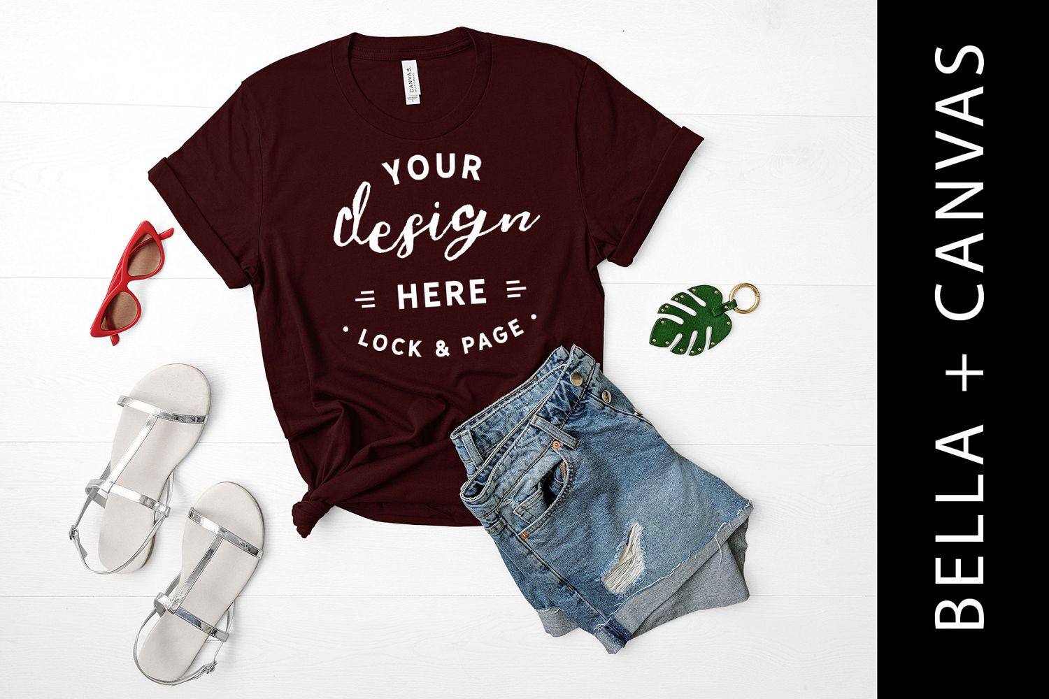 Oxblood Bella Canvas 3001 T Shirt Mockup Girls Flat Lay example image 1