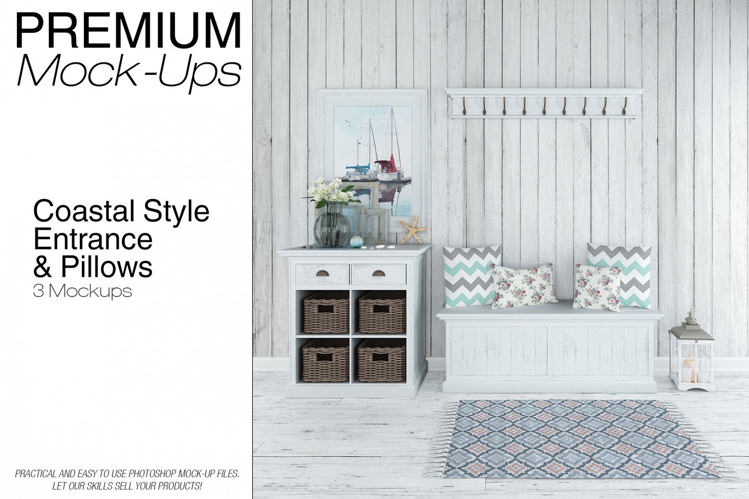 Coastal Style Entrance Hall with Throw Pillows Mockup Set example image 1
