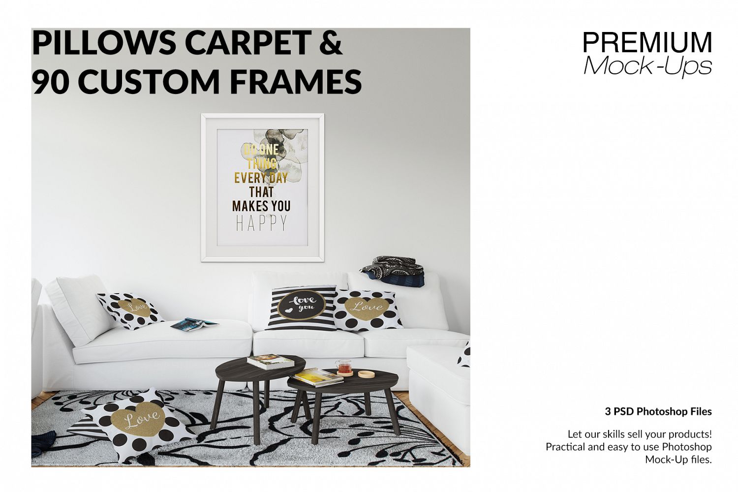 This Throw Pillows Carpet & Frames Set allows you to quickly display your designs and layouts into a digital photo realistic showcase.This pack contains:
