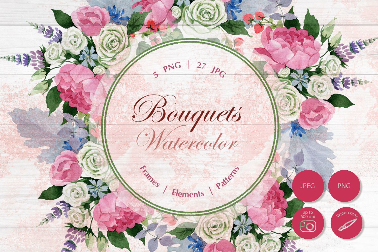Elements are painted by hand and every image is a separate file. The graphics are a PNG file, 600 dpi, without background. Patterns and Frames are JPG size 3500x3500px.