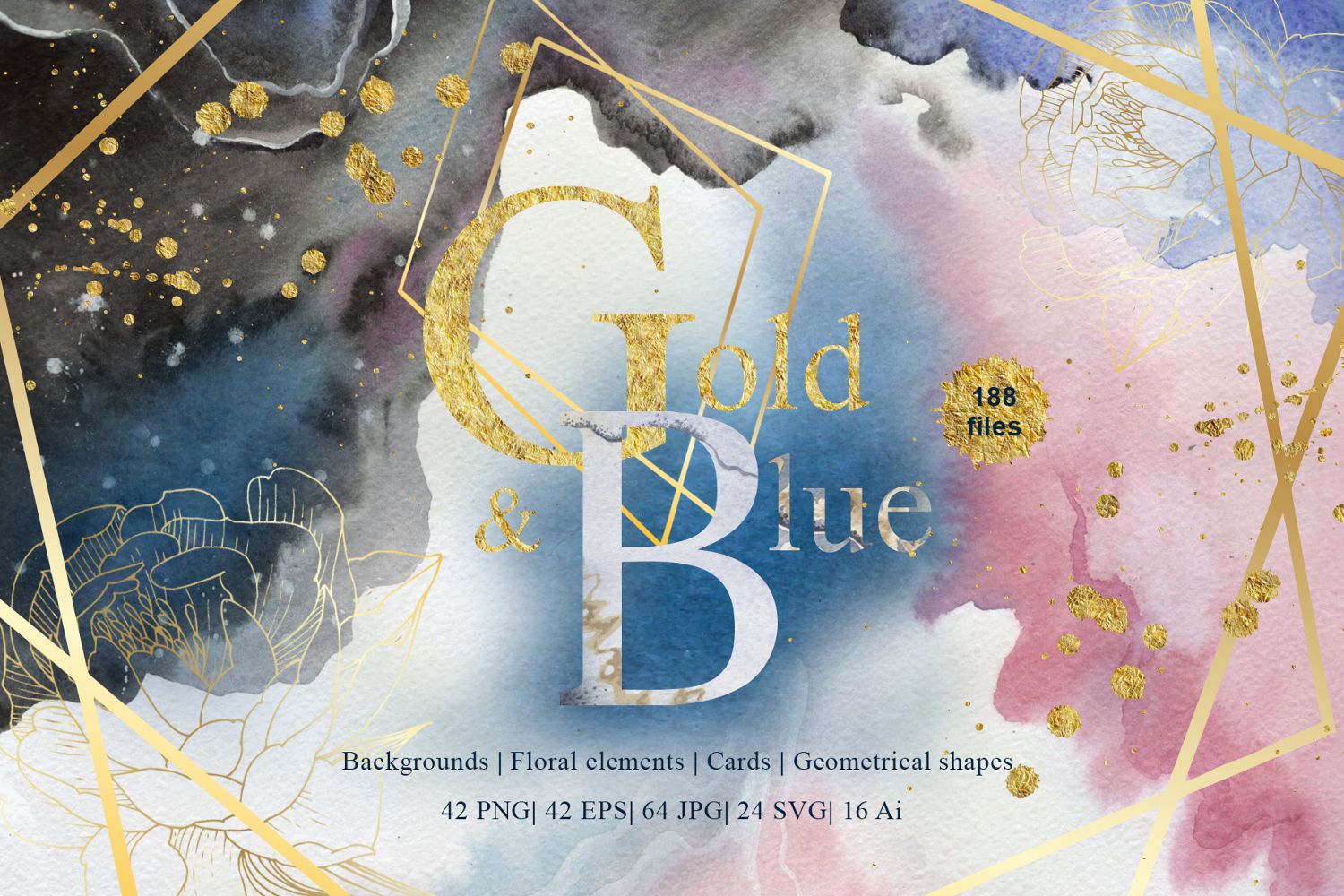 Gold and Blue Watercolor and Vector set of 188 files. Ideal material for DIY, wedding invitations, greeting cards, quotes, blogs, posters and more.