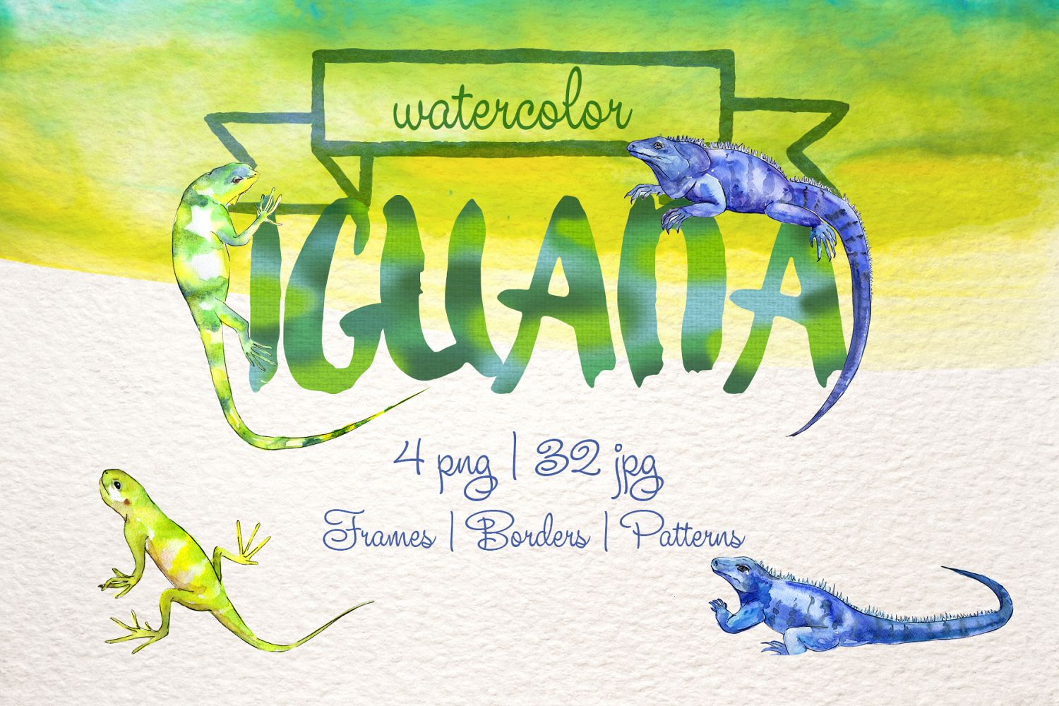 Exotic iguana in a watercolor set of 36 files. Aquarelle exotic reptilian for background, texture, wrapper pattern or tattoo. Ideal material for DIY, zoo, greeting cards, quotes, blogs, posters and more.