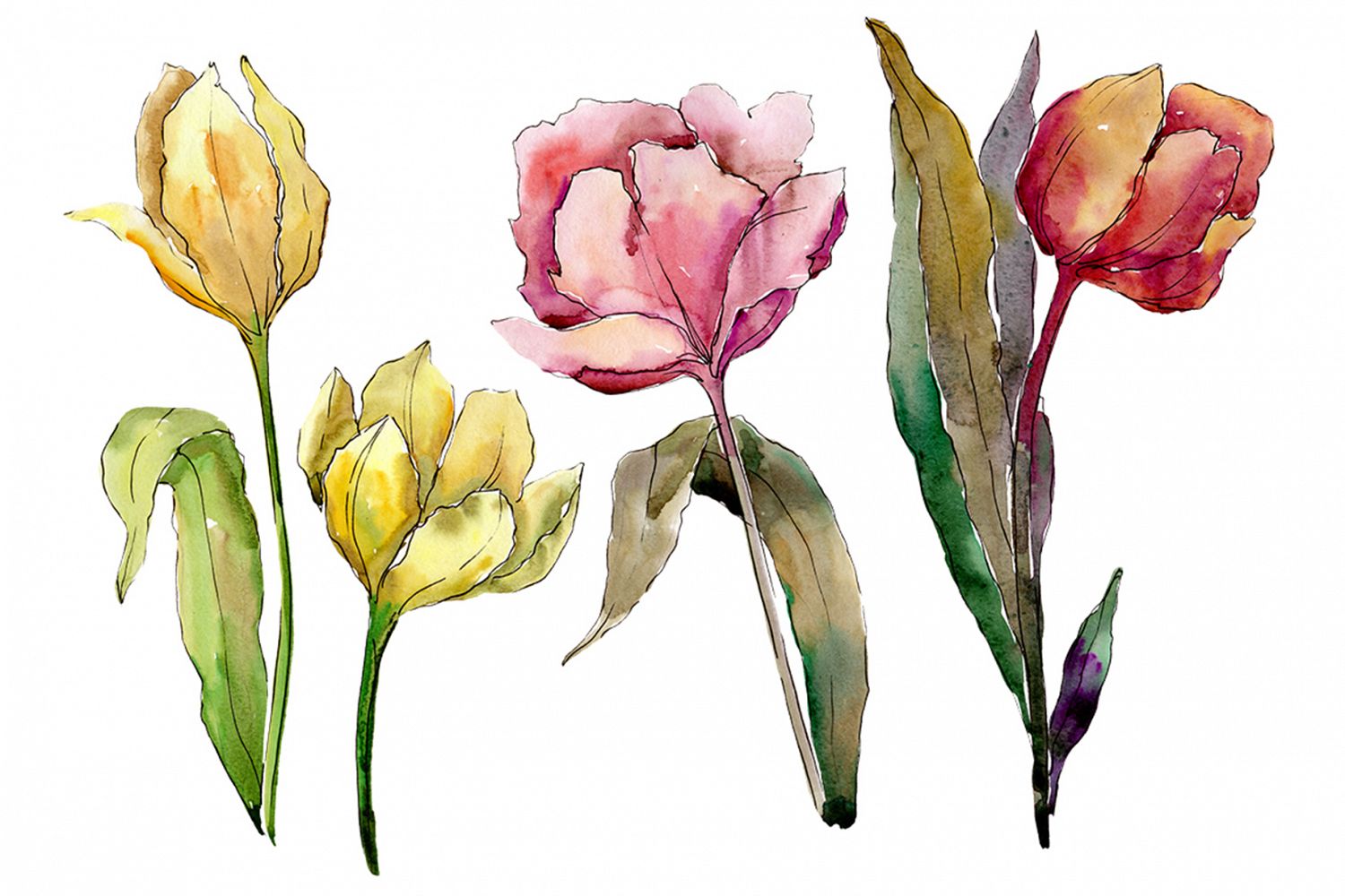 Colorful tulips flowers watercolor set of 4 files. Flowers on a transparent background. Floral botanical flower. Ideal material for DIY, wedding invitations, greeting cards, quotes, blogs, posters and more.