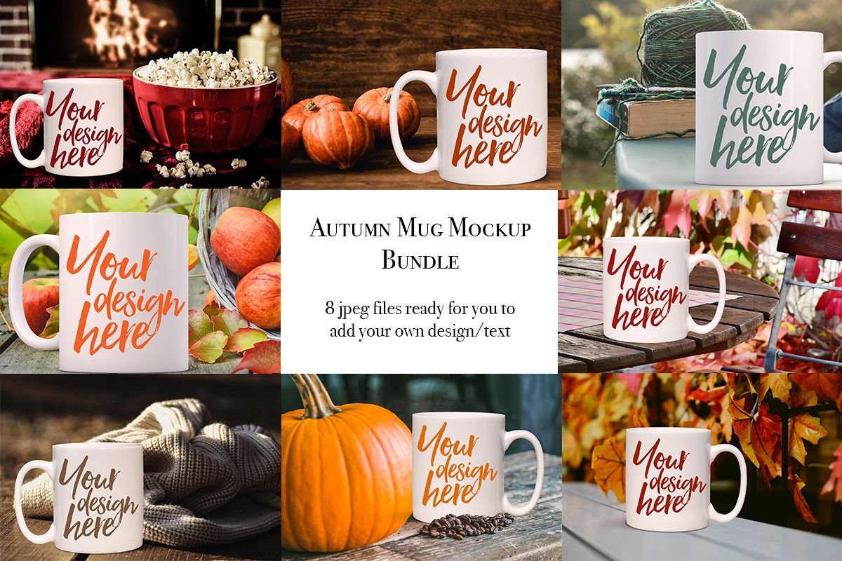 Lovely Autumnal mug mock-up bundle - 8 natural Autumn/Fall themed hi-res white mug mockups.