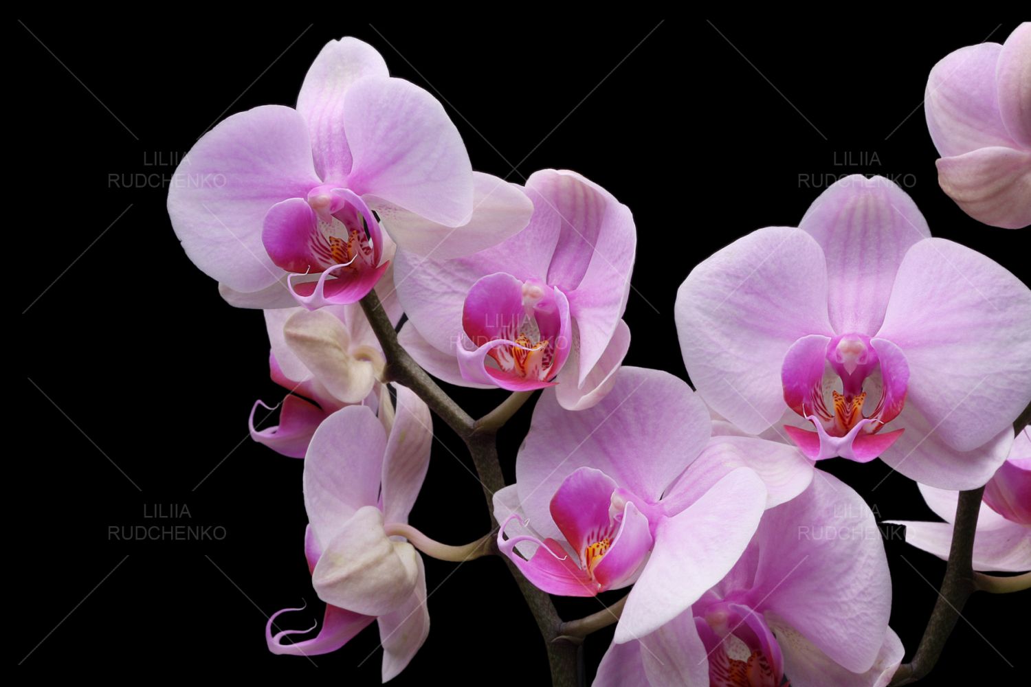 aromatherapy; background; beauty; black; blossom; bouquet; branch; bud; card; closeup; copy-space; cover; dark; floral; flower; frame; gift; isolated; nature; nobody; orchid; petal; pink; romance; spa; spring; stem; studio; text; tropical