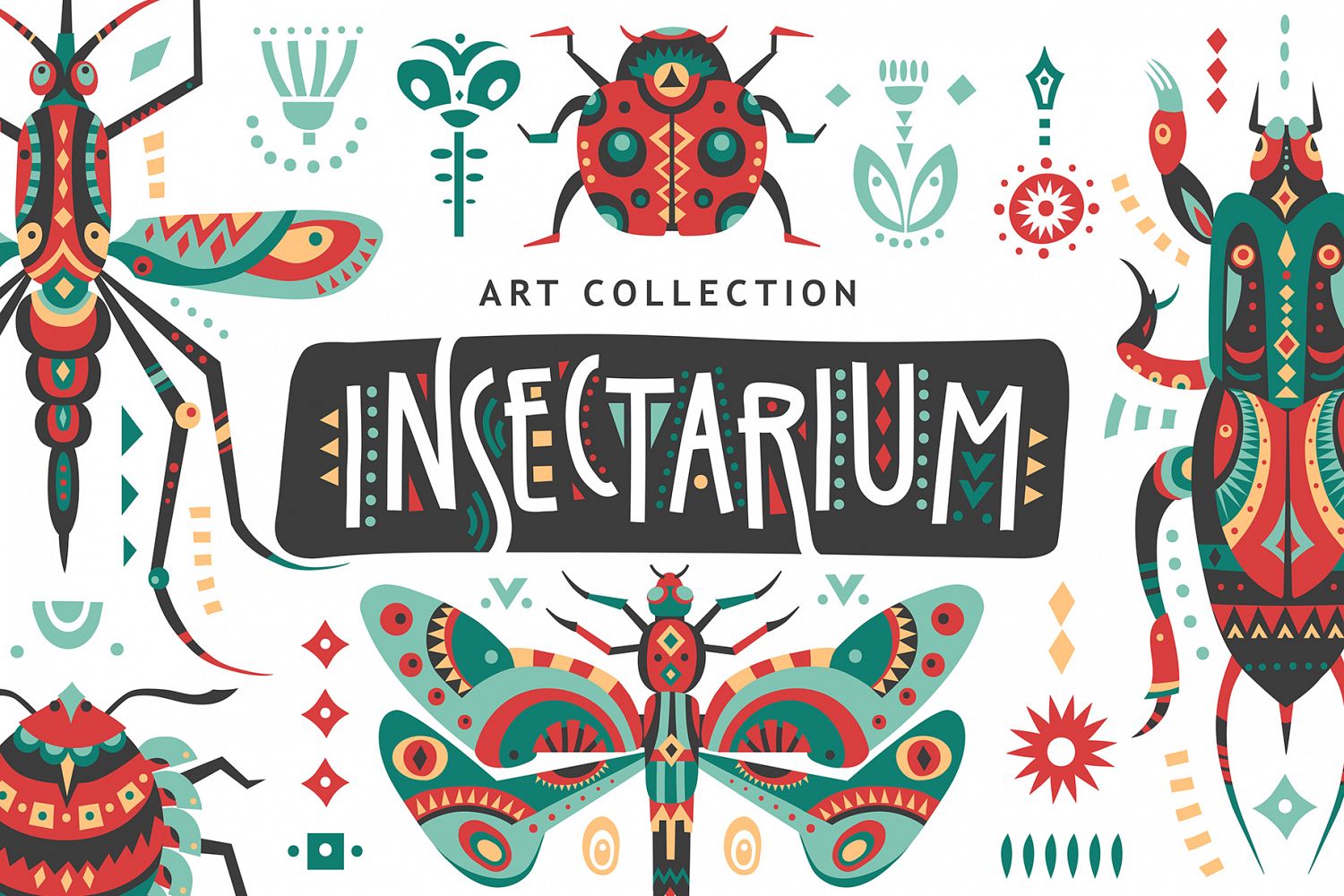 Art collection includes various stylized insects, decorative alphabet and extras-elements. You can create original t-shirt prints, childish posters, book covers and tattoos. Also you can decorate cafe or your house in unusual ethnic style. The decorative alphabet is suitable for lettering and perfectly combined with illustrations.