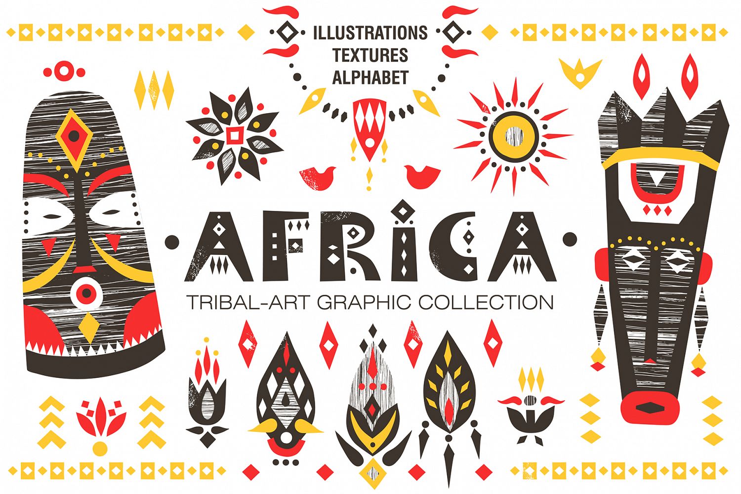 Tribal-art collection includes hand-drawn African masks, decorative alphabet, extras-elements and black and white textures. You can create original t-shirt prints, music posters, touristic brochures, unusual summer design. Also you can decorate cafe or your house in the African style. The silhouettes of the collection works great for photo overlays. The decorative alphabet is perfectly combined with illustrations. The textures of this set are suitable for fabrics and wrapping paper.