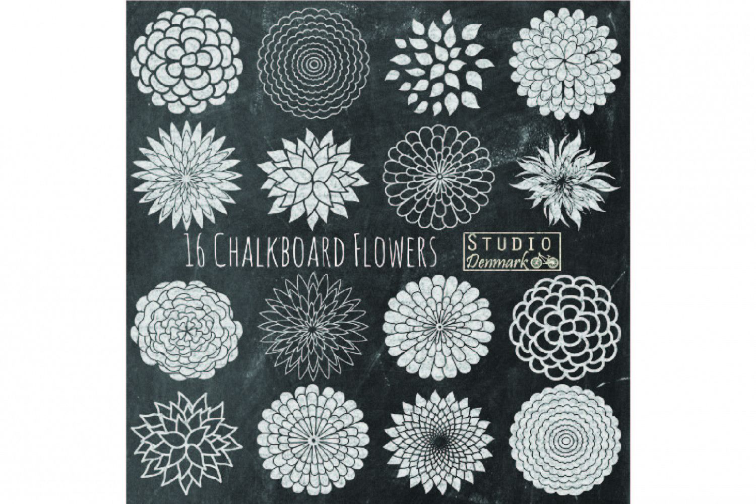 This chalk clipart set includes 16 chalk elements in total: 11 chalk flowers and 5 flower outlines. The flower style is a simple mum shape in different patterns, both solid and outline. All were created at 300 dpi for quality printing, and sized to approximately 6 inches (1800 px) at the widest point.