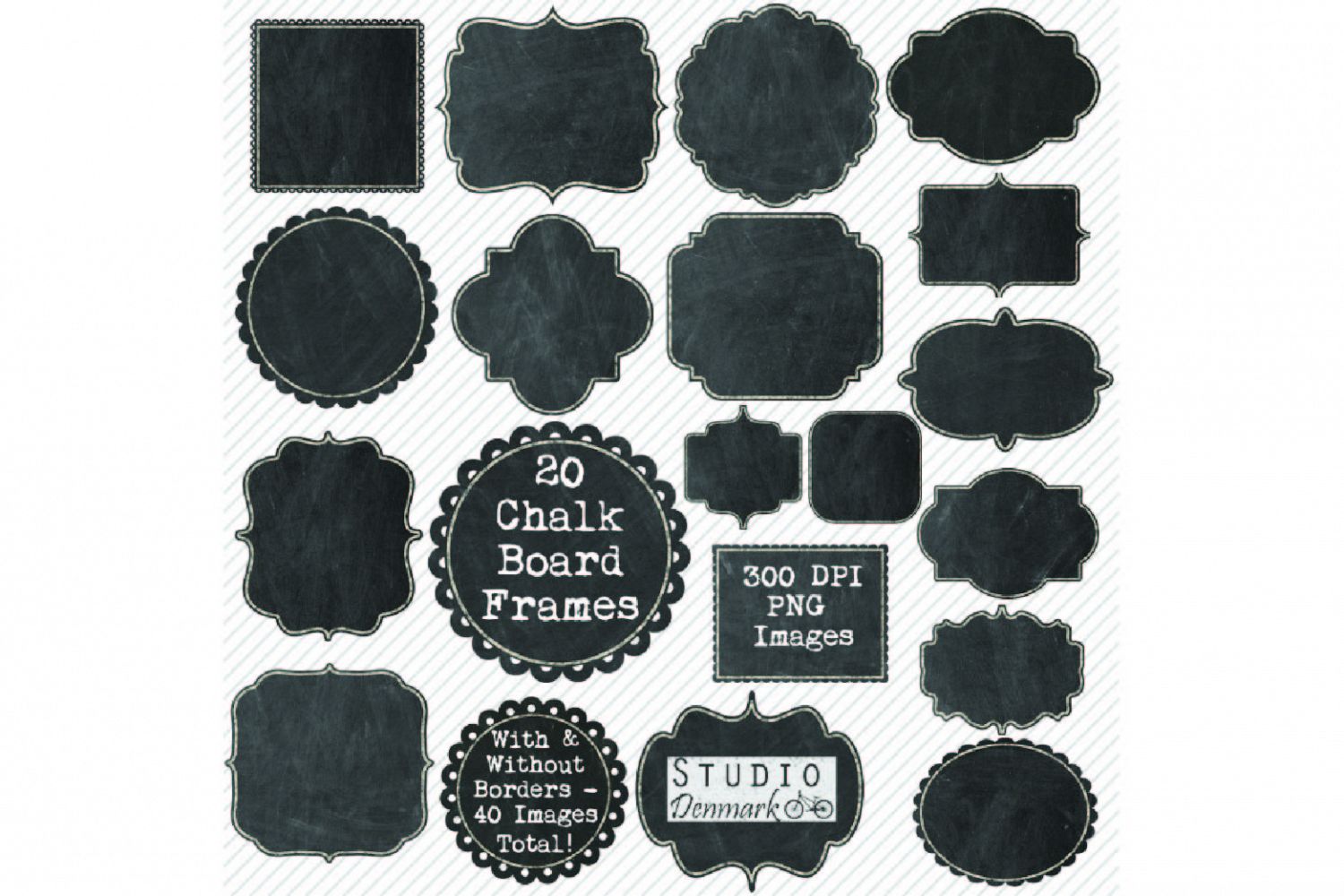 This clipart set includes 20 chalkboard frames / labels / tags, made from high resolution images of real chalkboards covered with chalk dust in varying levels of density - perfectly imperfect! The frames come in several different styles including squares, circles, scallops, brackets, geometric and traditional tag styles as shown. For each image, you will receive 2 PNG files - one edged with a chalk border, and one without - both with a transparent background, at 300 dpi resolution and sized to 6 inches (1800 px) at its widest point. That's 40 total files that you will receive!
