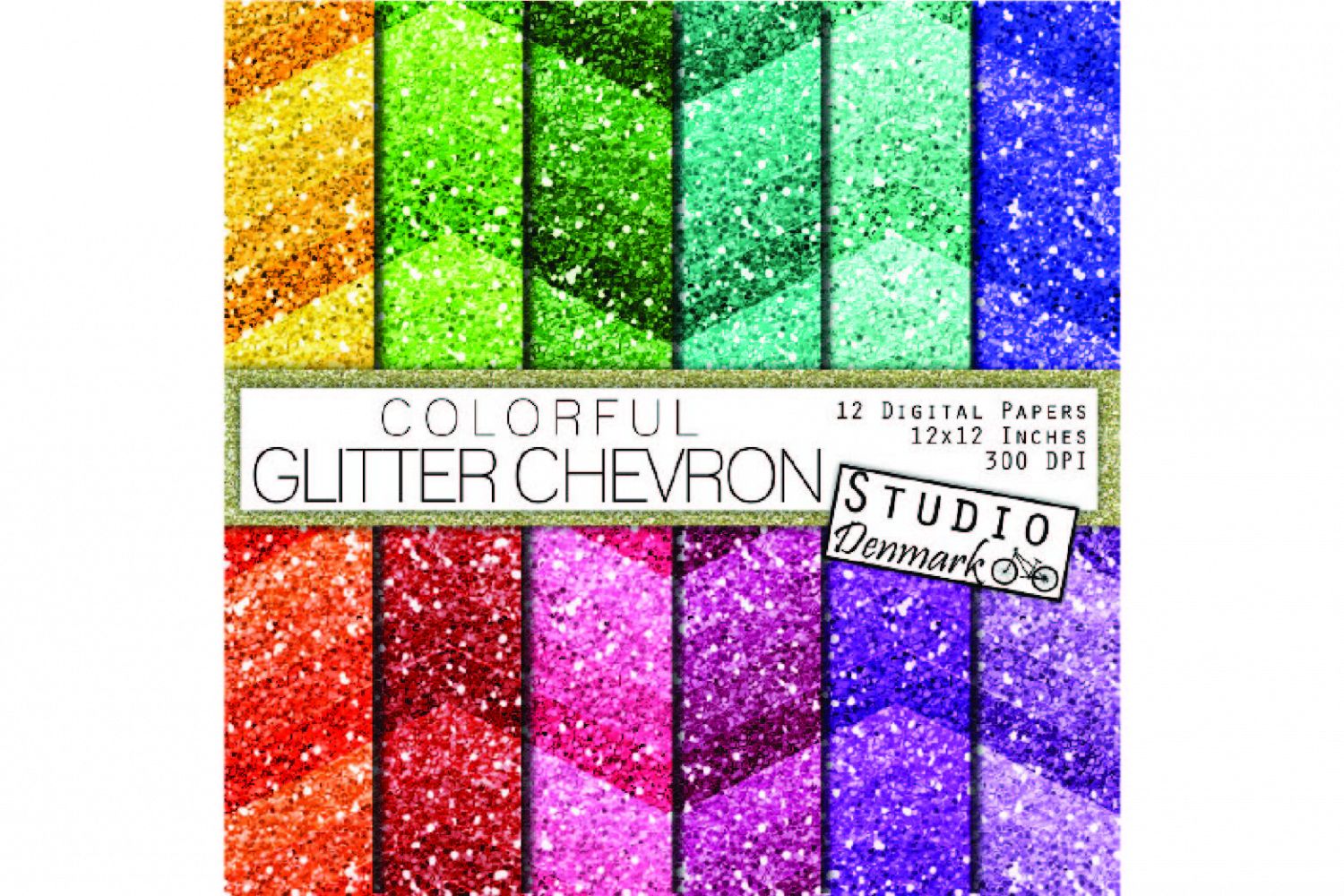 This collection includes 12 high quality 300 dpi digital papers in 12 x 12 inch size. Each paper is a large ombre chevron pattern on a chunky glitter texture in a different bright color including blue, green, yellow, pink, orange and purple.