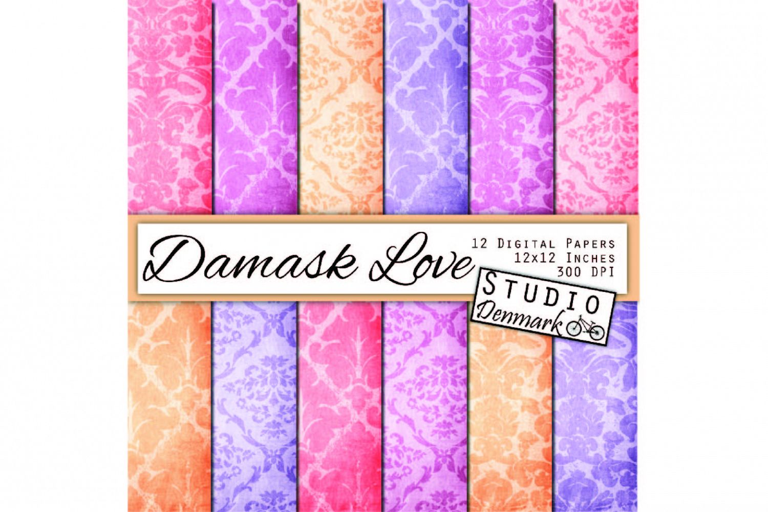 • This collection includes 12 high quality 300 dpi digital papers in 12 x 12 inch size. Each paper displays a shabby damask pattern in lilac, rose, peach, and purple colors.