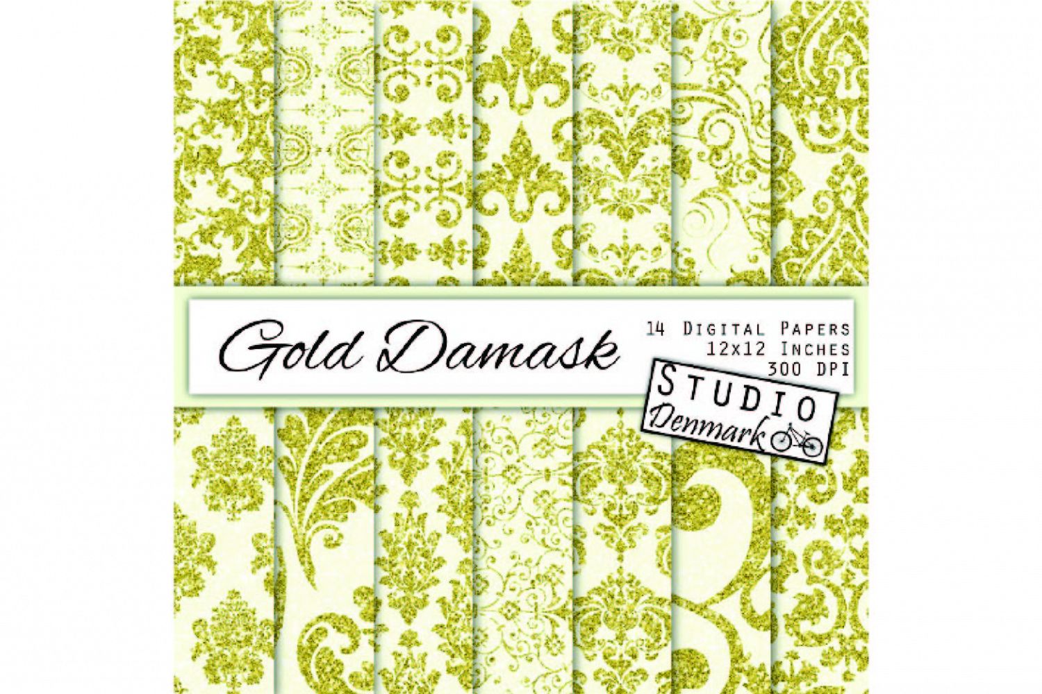 This collection includes 14 high quality 300 dpi digital papers in 12 x 12 inch size. Each paper displays a unique damask pattern in ivory in ivory and rich gold glitter. The styles of damask range from light and frilly to classic and bold.