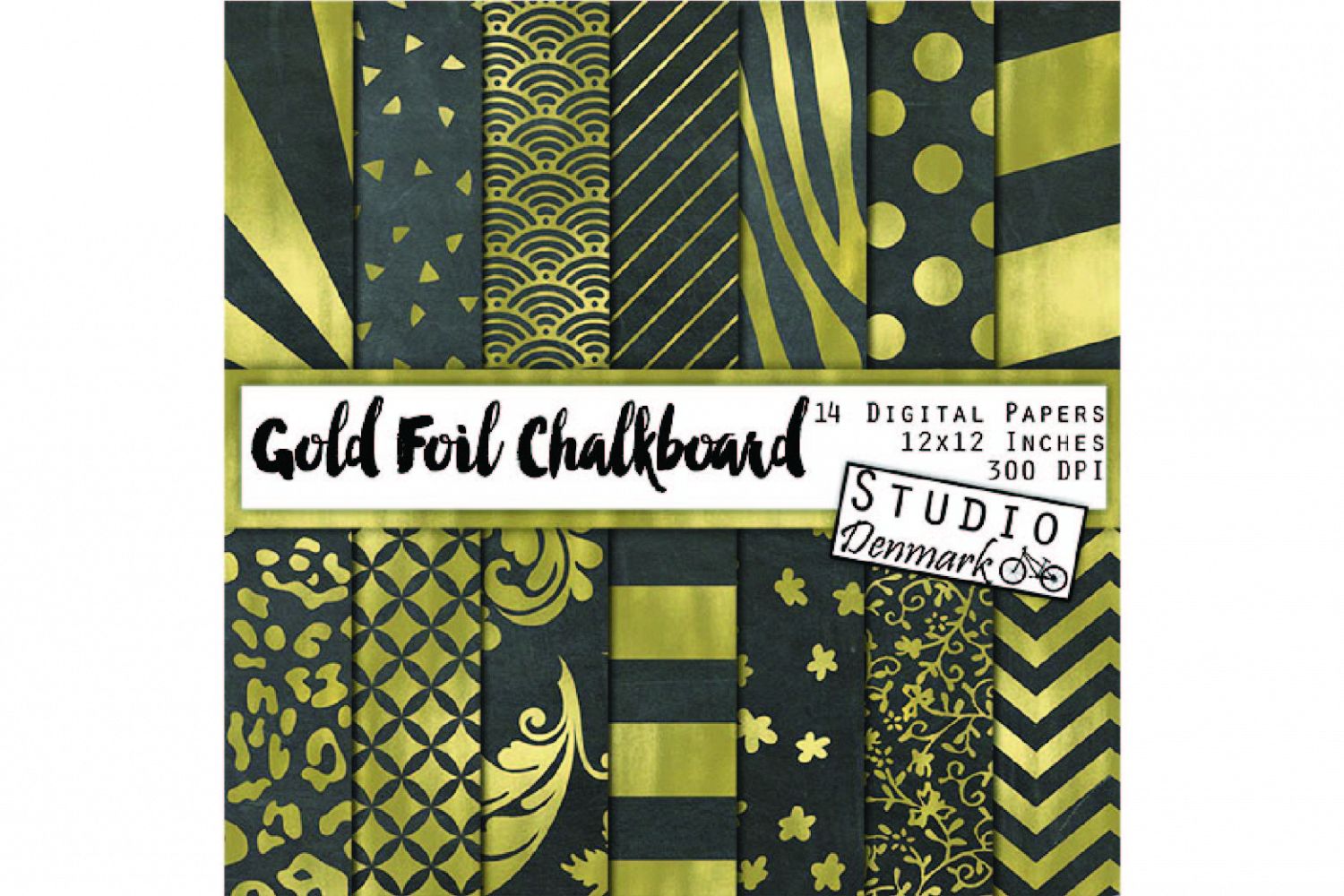 This amazing collection includes 14 high quality 300 dpi digital papers in 12 x 12 inch size. Each paper is a unique pattern in gold foil on a chalkboard background. The patterns include stripes, floral, leopard, zebra, chevron, and more!