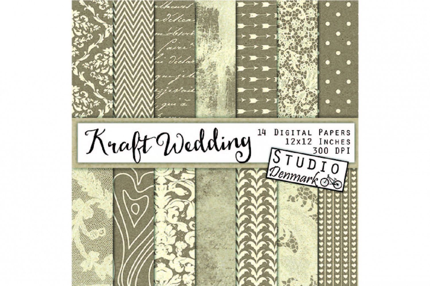 This collection includes 14 high quality 300 dpi digital papers in 12 x 12 inch size. These papers are perfect for kraft wedding projects and include elegant lace, paint, arrows, hearts, dots, script, chevron, and more, all in ivory on a rustic kraft background.