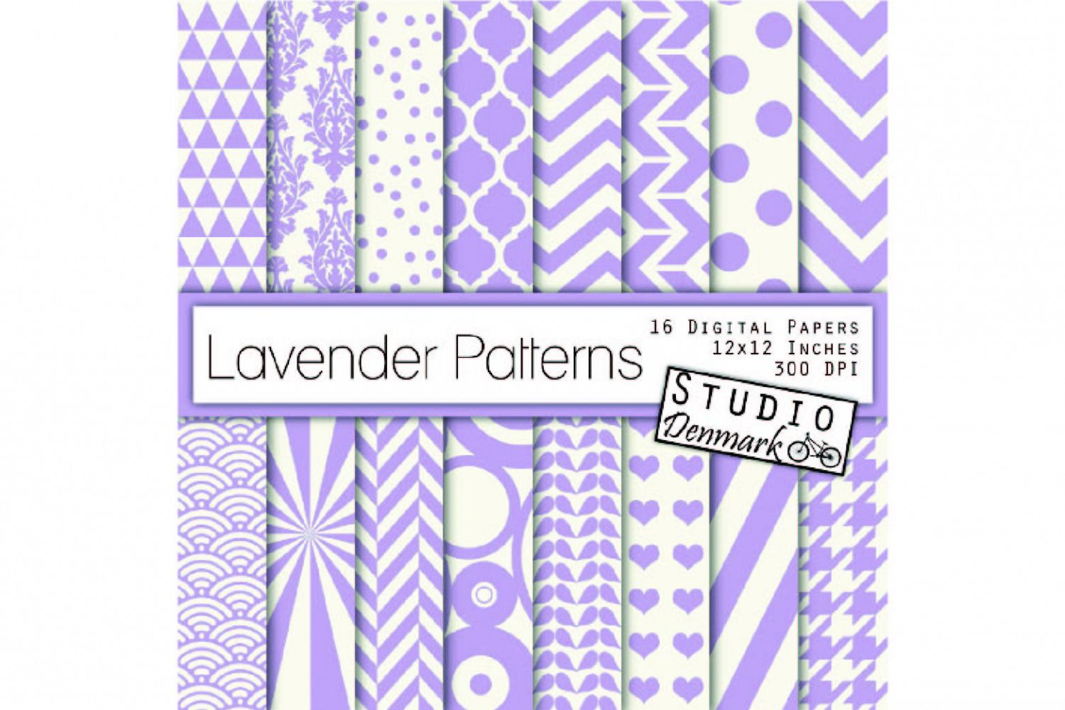 This collection includes 16 high quality 300 dpi digital papers in 12 x 12 inch size. Each paper displays a unique basic pattern in a lavender / light purple shade, with ivory. The patterns include 3 chevron, stripes, poka dots, confetti, sunburst, houndstooth, triangles, geometric circles, herringbone, hearts, damask, moroccan, leaves, and rising suns.