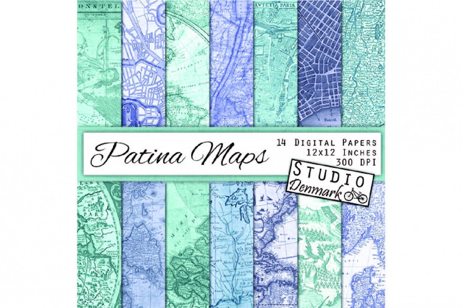 This collection includes 14 detailed, high quality 300 dpi digital papers in 12 x 12 inch size, all made from different high resolution vintage maps, including maps of North America, various countries and areas of Europe from ages past, and cities such as New York, Tokyo, and Paris. Each map is a an aged blue or teal / green patina shade.