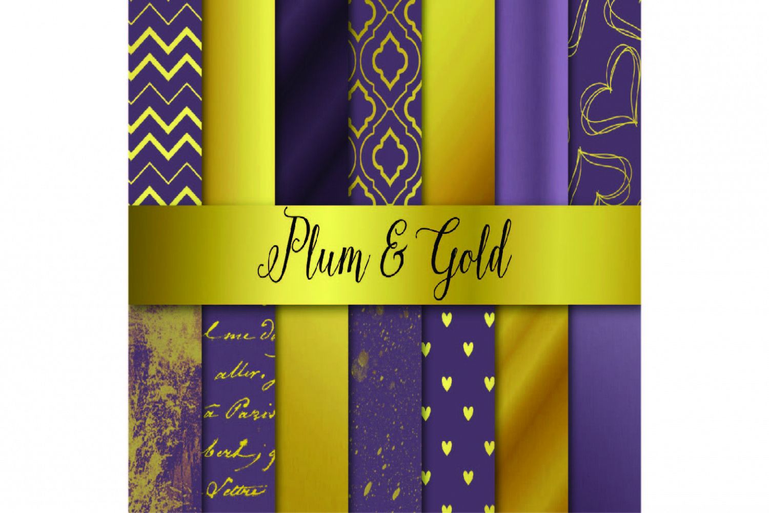 This collection includes 14 high resolution 300 dpi digital papers (JPG files) in 12 x 12 inch size, NOT seamless. Each paper is a beautiful, lovingly crafted wedding / Christmas background in plum and gold, including: