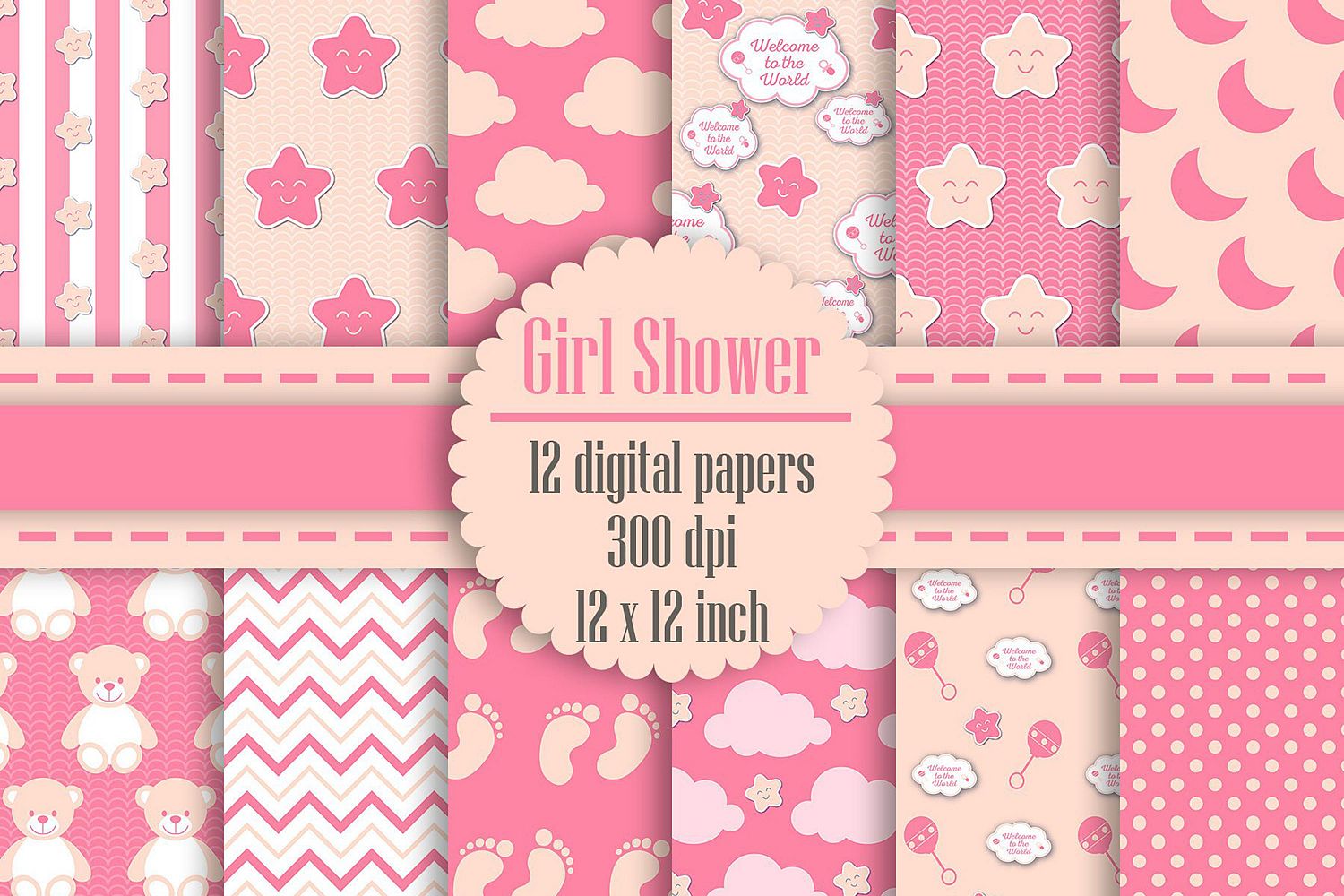This pack will be available as 1 zip file which contains 12 JPG Images about Pink and Cream Baby Girl Shower Digital Papers. Each paper was created with in 12 x 12 inches (30.48 cm) and has 300 dpi resolution for the best quality printing.