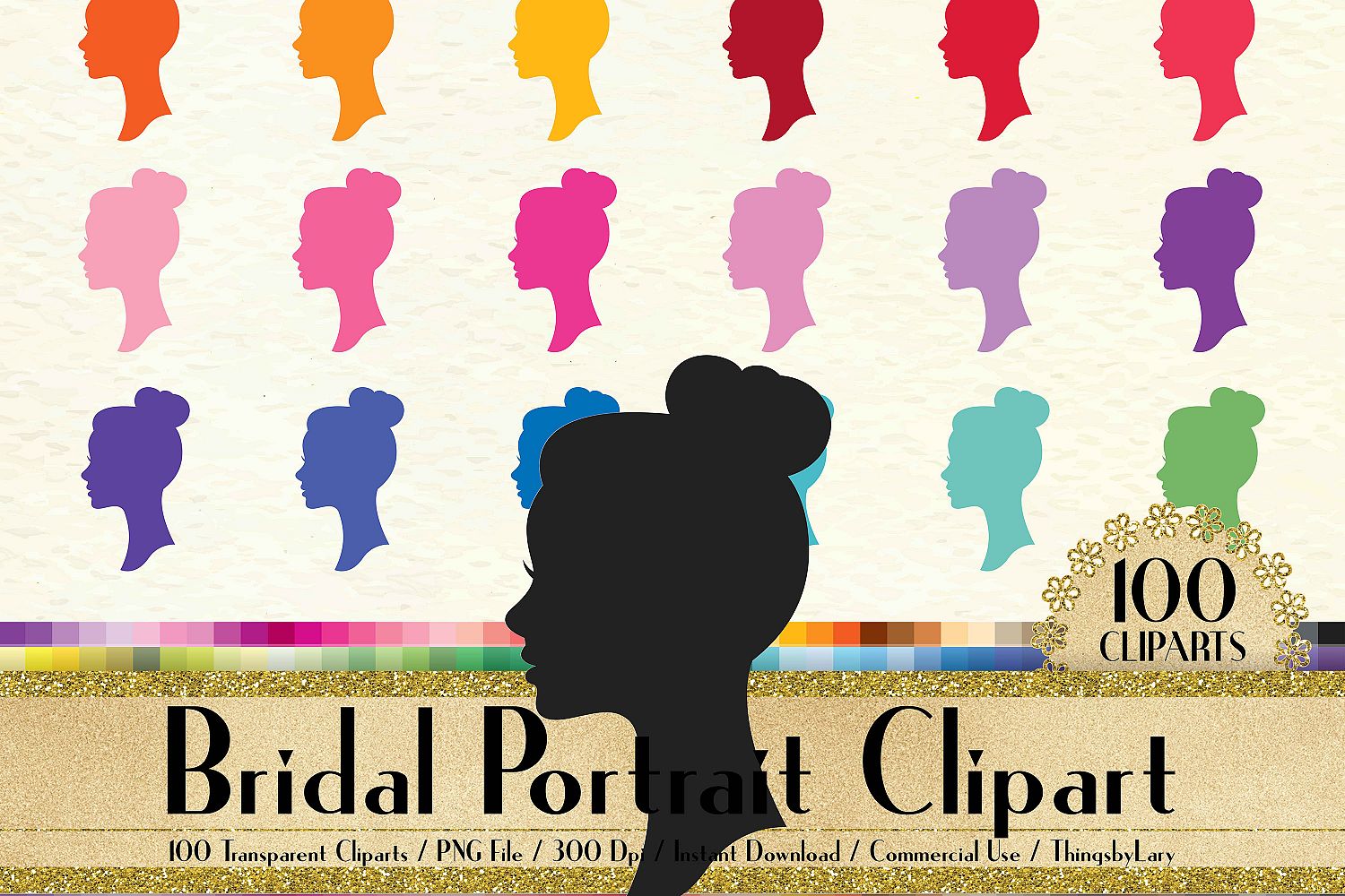 This pack will be available as 1 zip file which contains 100 PNG Images about Silhouette Bridal Portrait Clip Arts, Antique, Wedding in 100 different colors. Each image has size from 8 to 12 inch at the widest points and has 300 dpi resolution for the best quality printing.