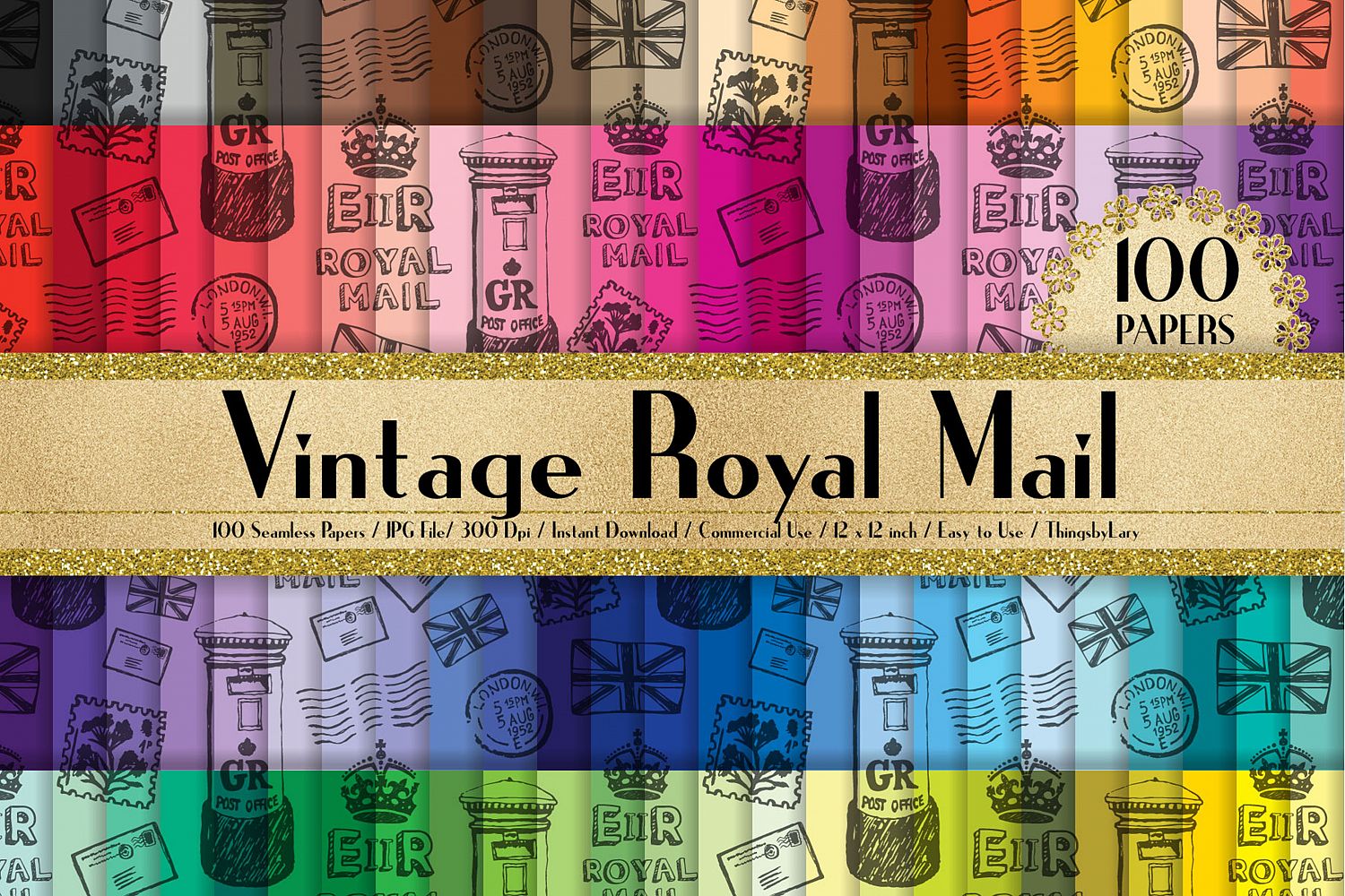 This pack will be available as 1 zip file which contains 100 JPG Images about Seamless Black Vintage Royal Mail Digital Papers in 100 different colors. Each paper was created with in 12 x 12 inches (30.48 cm) and has 300 dpi resolution for the best quality printing. This pack is created with seamless patterns. So you can tile them to get whatever size you like, also be used for fabrics or large prints.