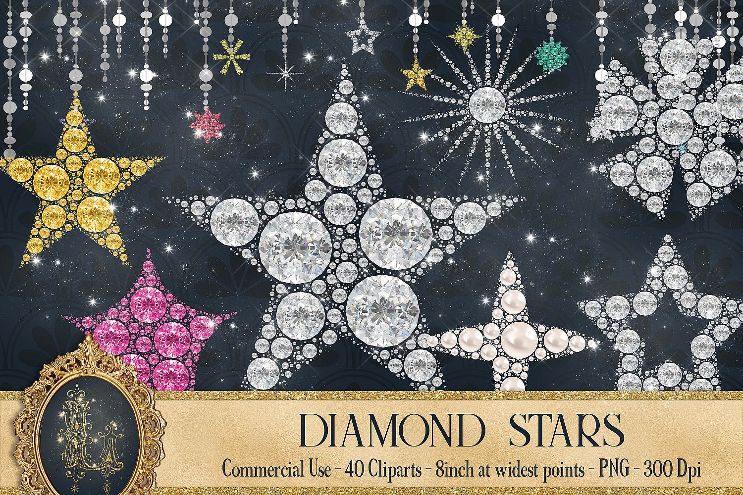 This pack will be available as 1 zip file which contains 40 PNG transparent Images about Diamond and Pearl Star Clip Arts, Star String, Pearl Star. Each clip art was created with transparent background, separated file easy to use and has 300 dpi resolution for the best quality printing.