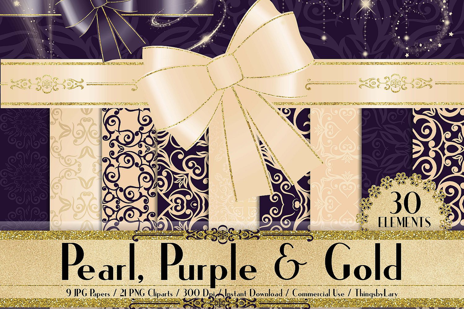 This pack will be available as 1 zip file which contains 9 JPG Papers and 21 PNG transparent Images about Luxury Pearl, Purple, Gold Glitter Kit, Balloon, Bow, Lights. Each clip art was created with transparent background, separated file easy to use and has 300 dpi resolution for the best quality printing.