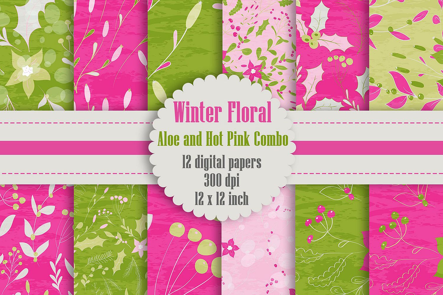 12 Winter Floral Digital Papers in Aloe and Hot Pink Color