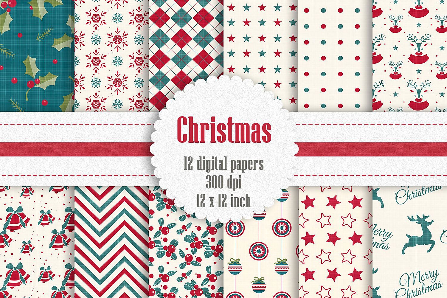 12 Christmas Digital Papers in Red, Green and Cream Color