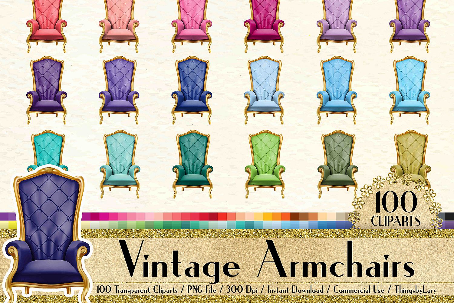 This pack will be available as 1 zip file which contains 100 PNG Images about Vintage Armchair Clip Arts, Antique, Retro, Royal in 100 different colors. Each image has size from 8 to 12 inch at the widest points and has 300 dpi resolution for the best quality printing.