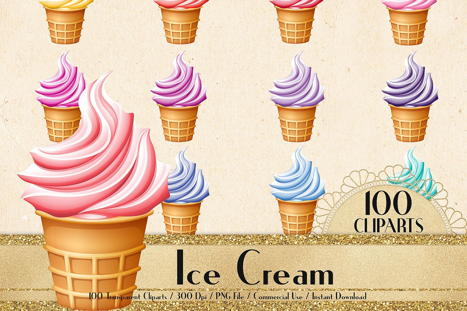 This pack will be available as 1 zip file which contains 100 PNG Images about Ice Cream Clip Arts, Birthday Party, Kid Scrapbook in 100 different colors. Each image has size from 8 to 12 inch at the widest points and has 300 dpi resolution for the best quality printing.