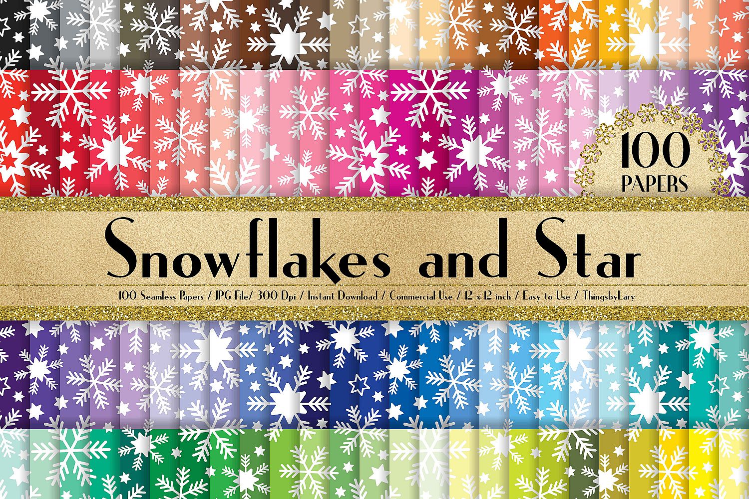 This pack will be available as 1 zip file which contains 100 JPG Images about Seamless Snowflakes and Stars Digital Papers in 100 different colors. Each paper was created with in 12 x 12 inches (30.48 cm) and has 300 dpi resolution for the best quality printing. This pack is created with seamless patterns. So you can tile them to get whatever size you like, also be used for fabrics or large prints.