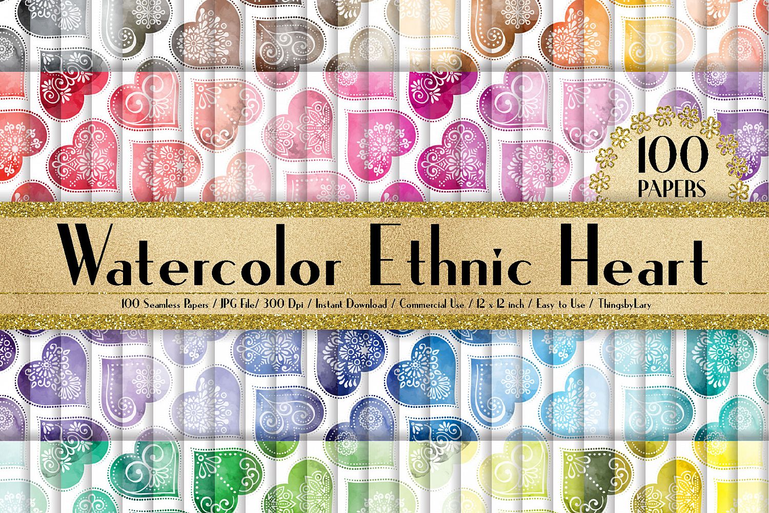 100 Seamless Watercolor Ethnic Heart Valentine Digital Paper example image 1