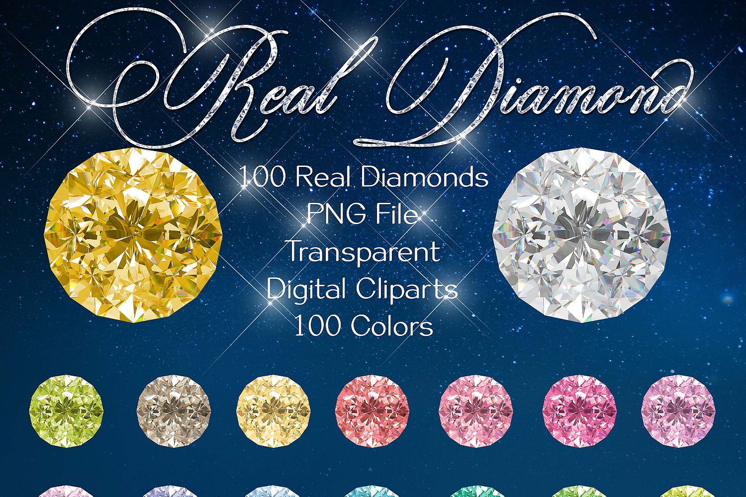 This pack will be available as 1 zip file which contains 100 PNG transparent Images about Real Round Diamond Clip Arts, Wedding Diamond in 100 different colors. Each clip art was created with transparent background, separated file easy to use and has 300 dpi resolution for the best quality printing.