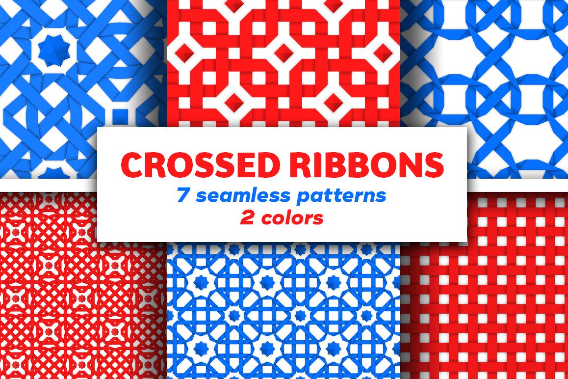 Seamless patterns set with red and blue color crossed ribbons